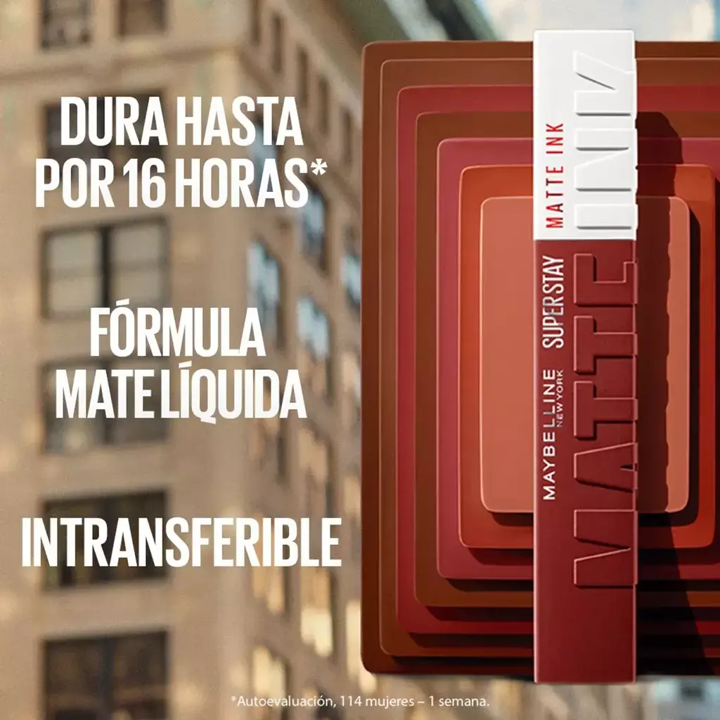 El labial líquido Maybelline Super Stay Matte Ink en tono 500 Charmer es ideal para quienes buscan un color nude rosado con acabado mate que dure todo el día. Su fórmula de alta pigmentación ofrece hasta 16 horas de duración sin transferencias, y su aplicador en forma de flecha permite una aplicación precisa y uniforme.